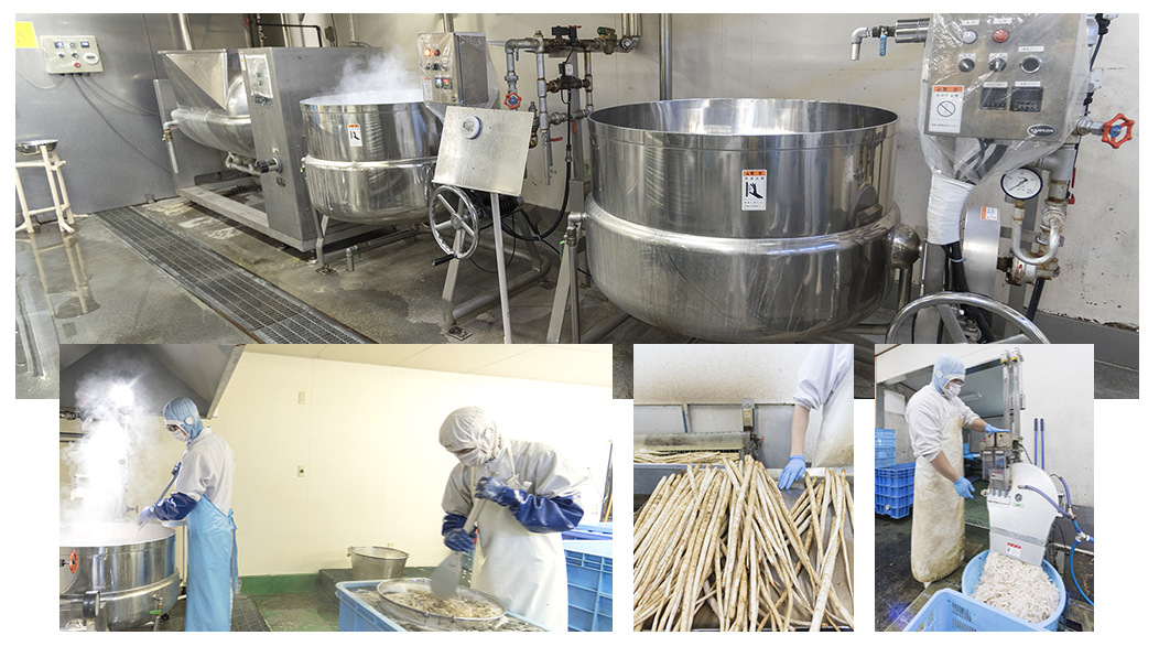 当施設内には、お客様の利用用途に合わせて食品のカット、ボイルにご対応差し上げております。手作業によるカットから、機械等による乱切りやみじん切り、細切、スチームで蒸す、大釜でゆでるといったサポートを行います。
